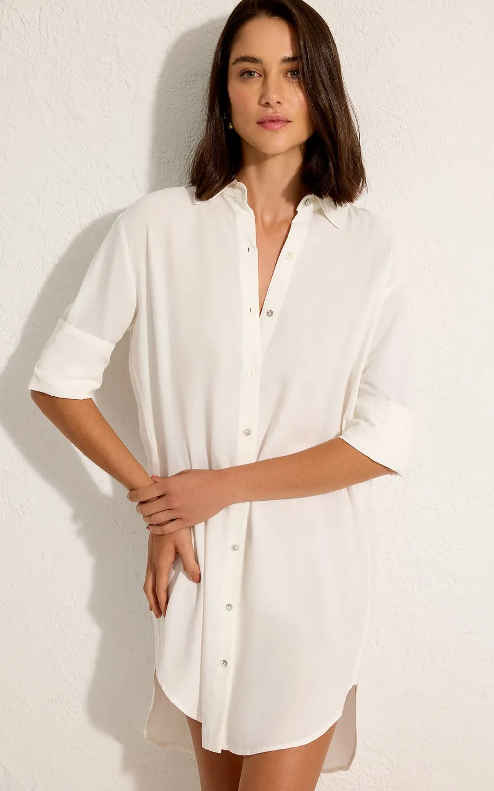 A refined take on the timeless chemisier, designed to balance sophistication and ease. Crafted in soft viscose, this piece features a classic silhouette enhanced by ¾ sleeves with cuff detailing for a polished finish. The scalloped hem and softly rounded sides introduce a modern edge, elevating the traditional shirt-dress aesthetic.